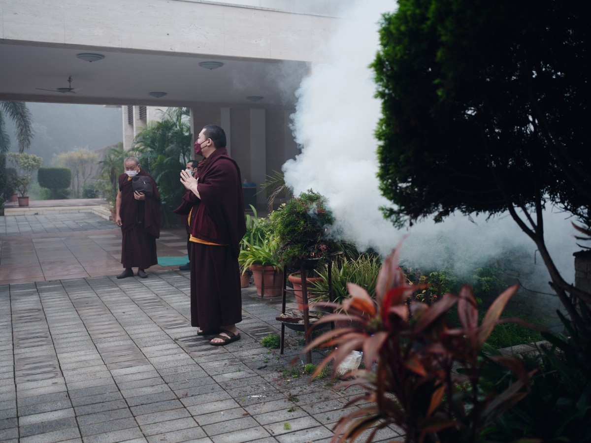 As the Kudung of the late spiritual master approached KIBI, a procession of monks in ceremonial garb holding incense and playing ritual instruments stood lining the street and guided the Kudung to KIBI in a solemn parade.