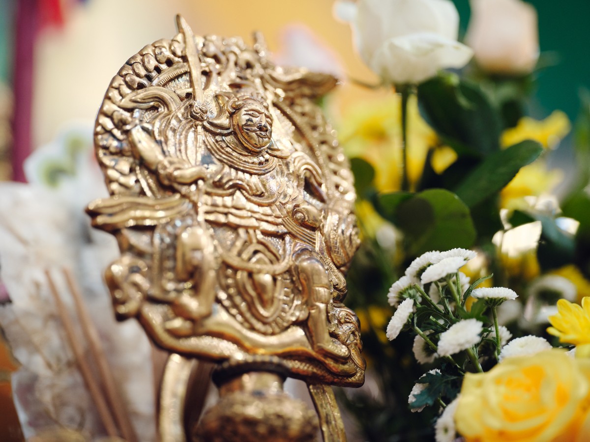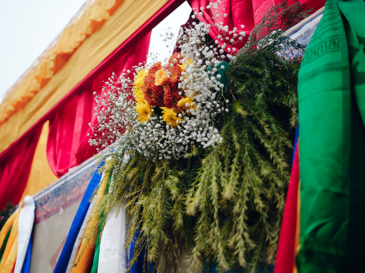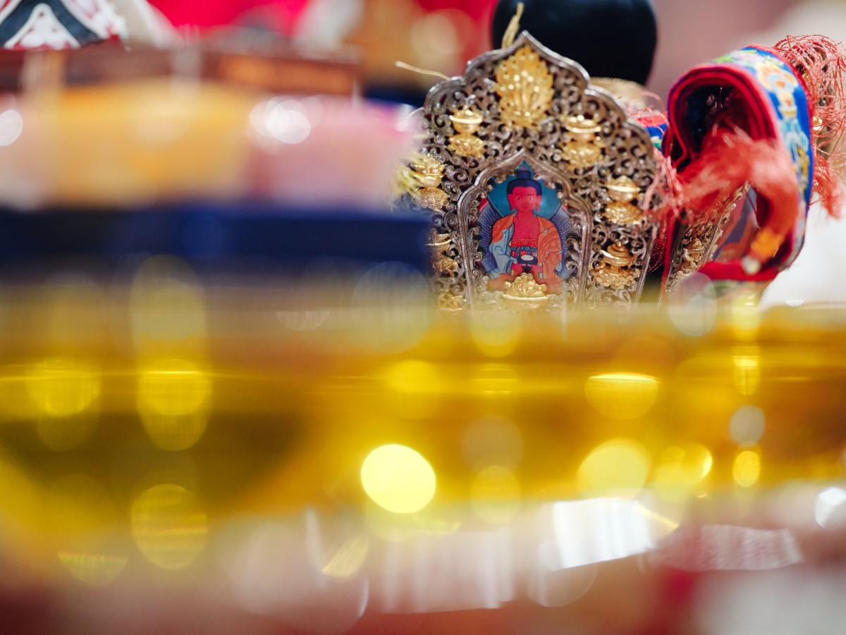 The case containing the mortal remains was then installed on a mandala table set up in front of KIBI’s main shrine, and the gathered monastic and lay devotees had the opportunity to pay their respect and offer ceremonial scarves and flowers before the Kudung.