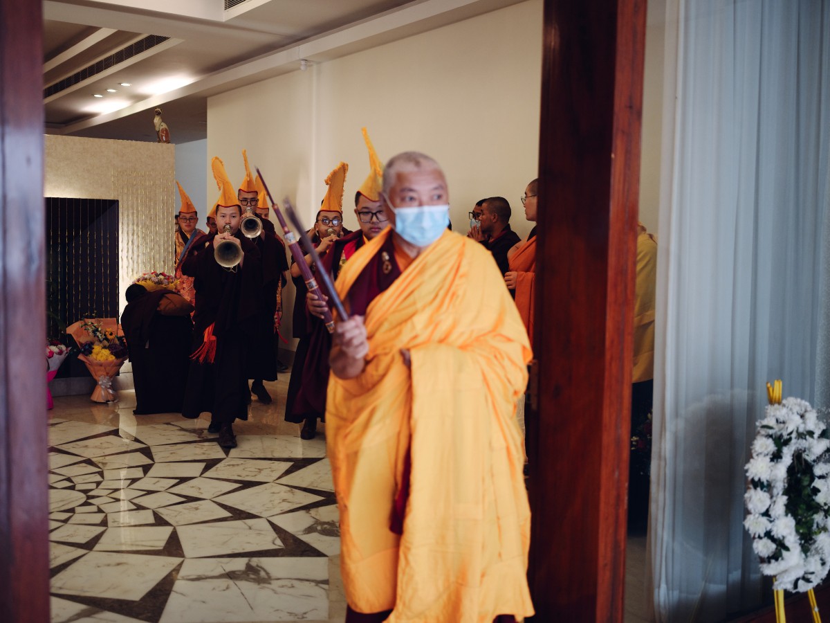 In the courtyard of KIBI, the Sangha, KIBI community and devotees offered a ceremonial welcome to the Kudung, led by Karmapa, his General Secretary His Eminence Jewon Jigme Rinpoche; and Khenchen Chodrak Tenphel.