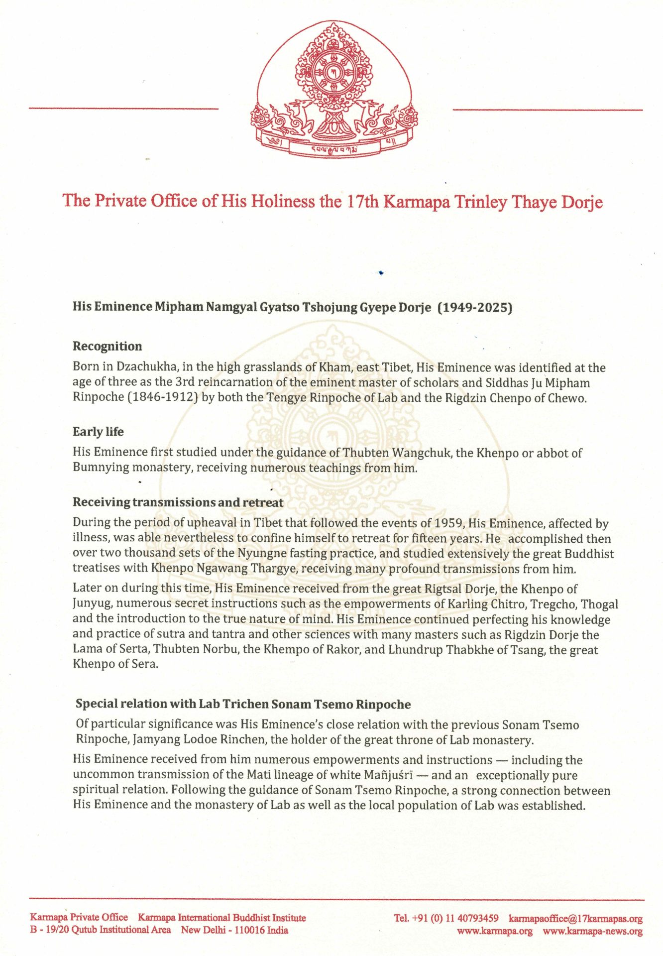 Compiled by the Private Office of His Holiness the Gyalwa Karmapa Trinley Thaye Dorje, Karmapa International Buddhist Institute, New Delhi, December 23, 2025.