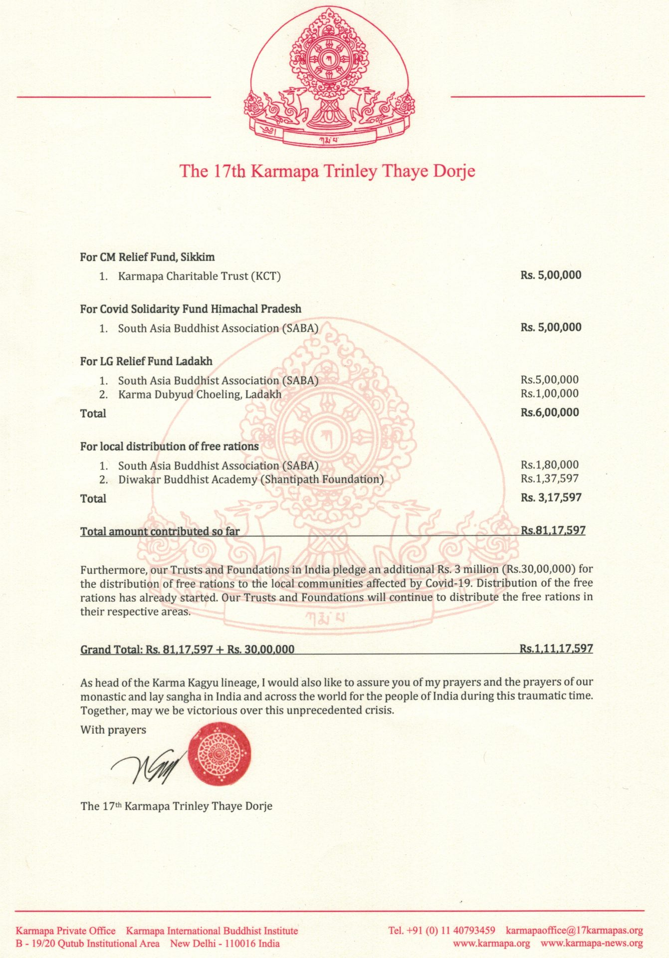 These contributions are a symbolic offering of appreciation and support from our lineage. On top of that, I would like to take this opportunity to express my appreciation to everyone around the world who contributes to efforts to tackle the Covid-19 pandemic, be it in the form of financial means, supplying food and other essentials, or any other kind of support.