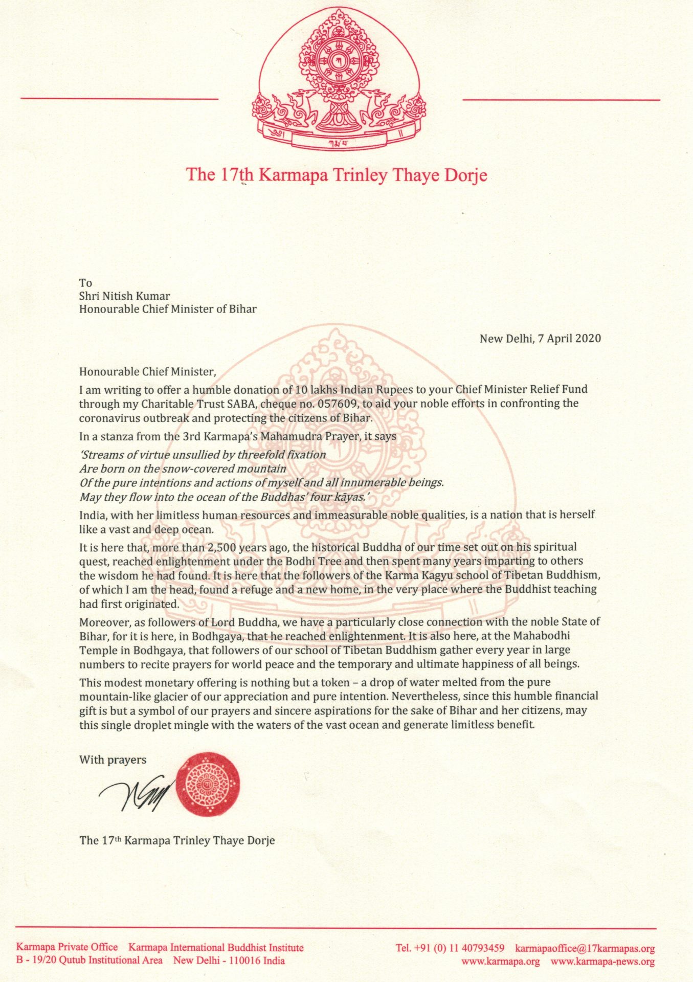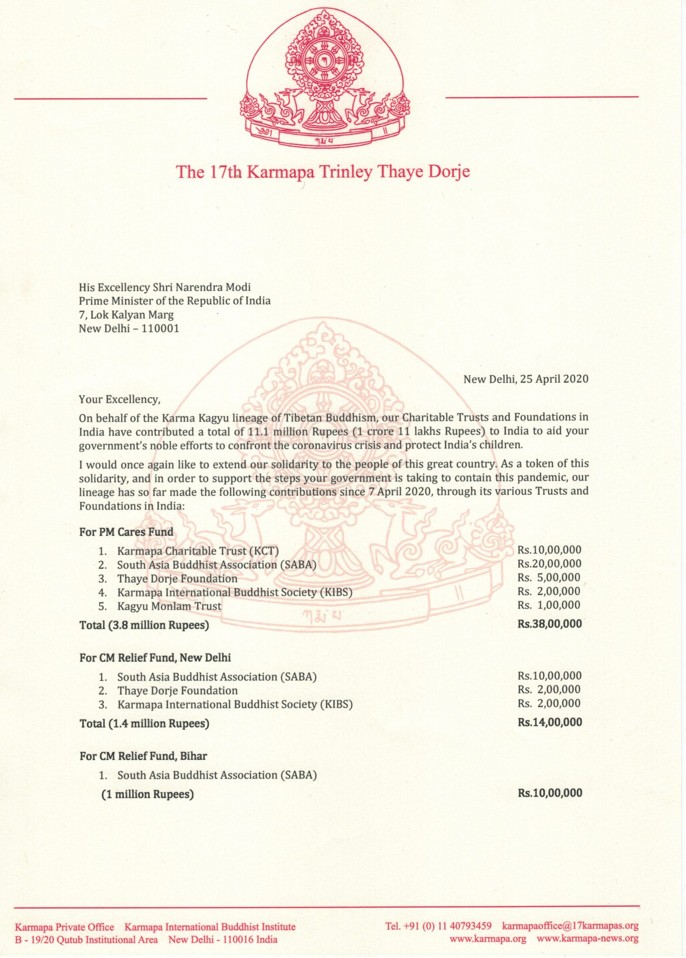 Thaye Dorje, His Holiness the 17th Gyalwa Karmapa, has donated 14.6 million rupees to India and Bhutan to support their efforts to address the coronavirus pandemic.