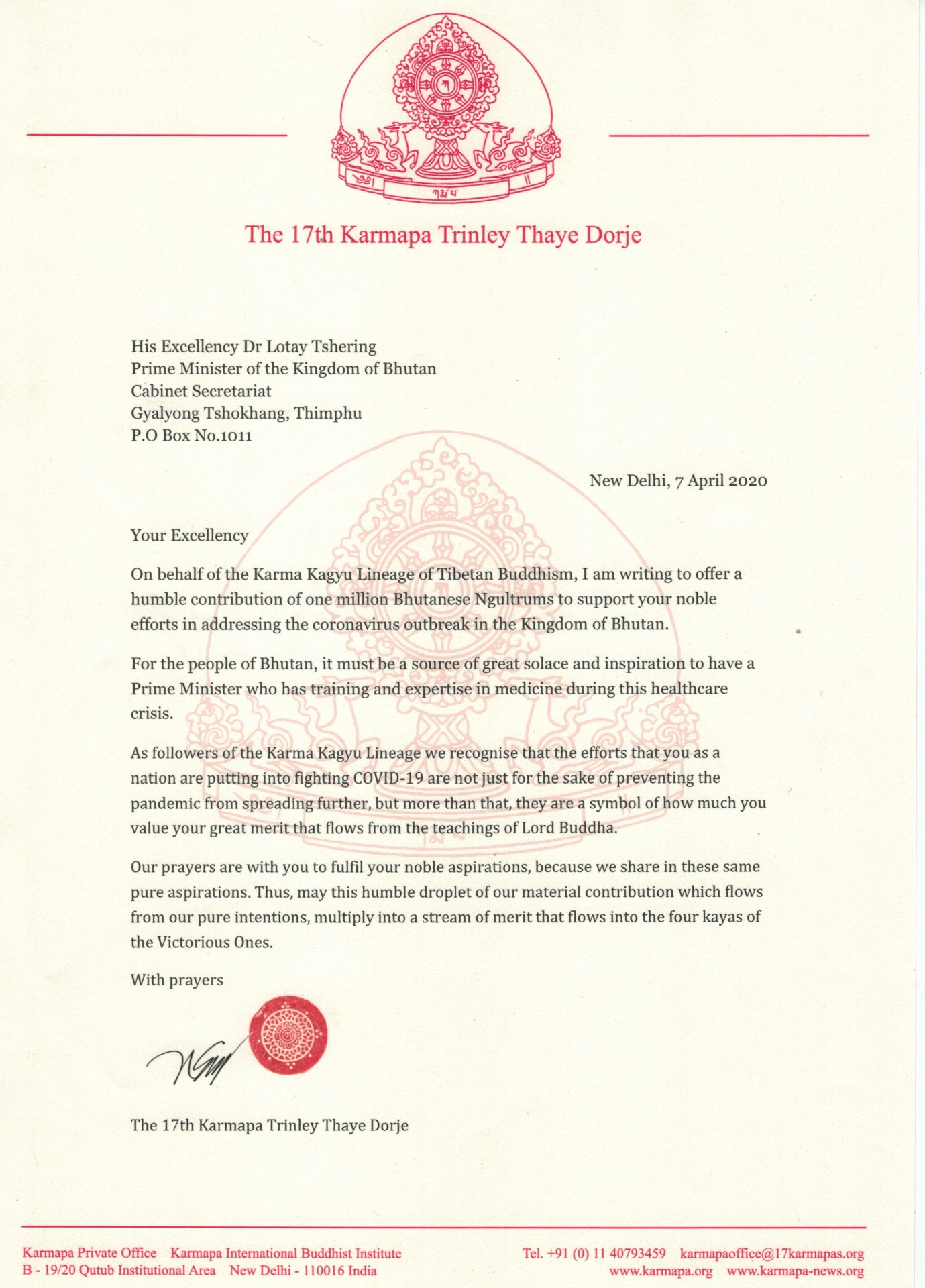 Letter to His Excellency Dr Lotay Tshering, Prime Minister of the Kingdom of Bhutan, dated 7 April 2020