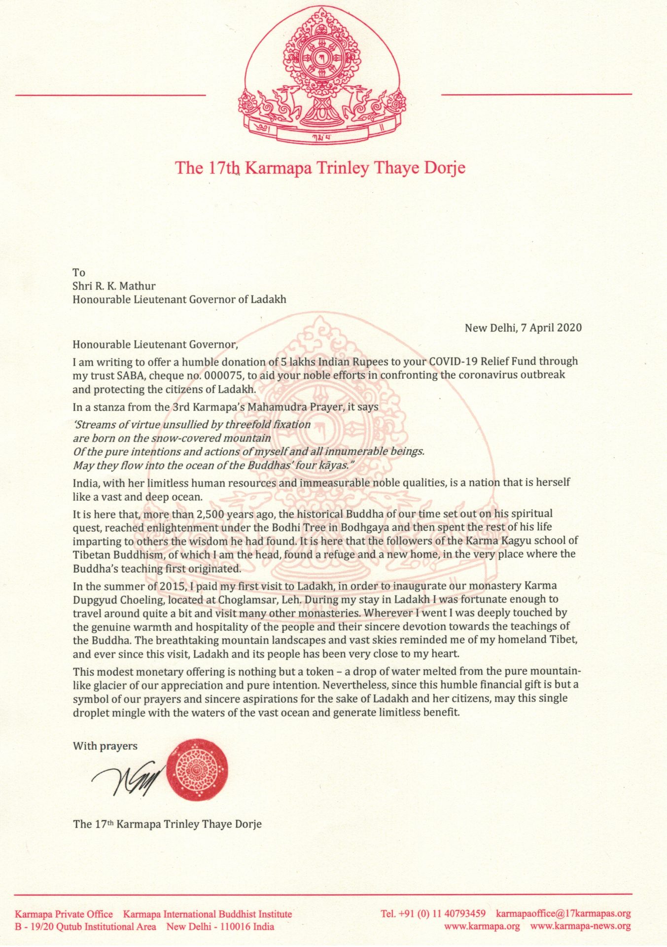 Letter to Shri R. K. Mathur, Honourable Lieutenant Governor of Ladakh, dated 7 April 2020