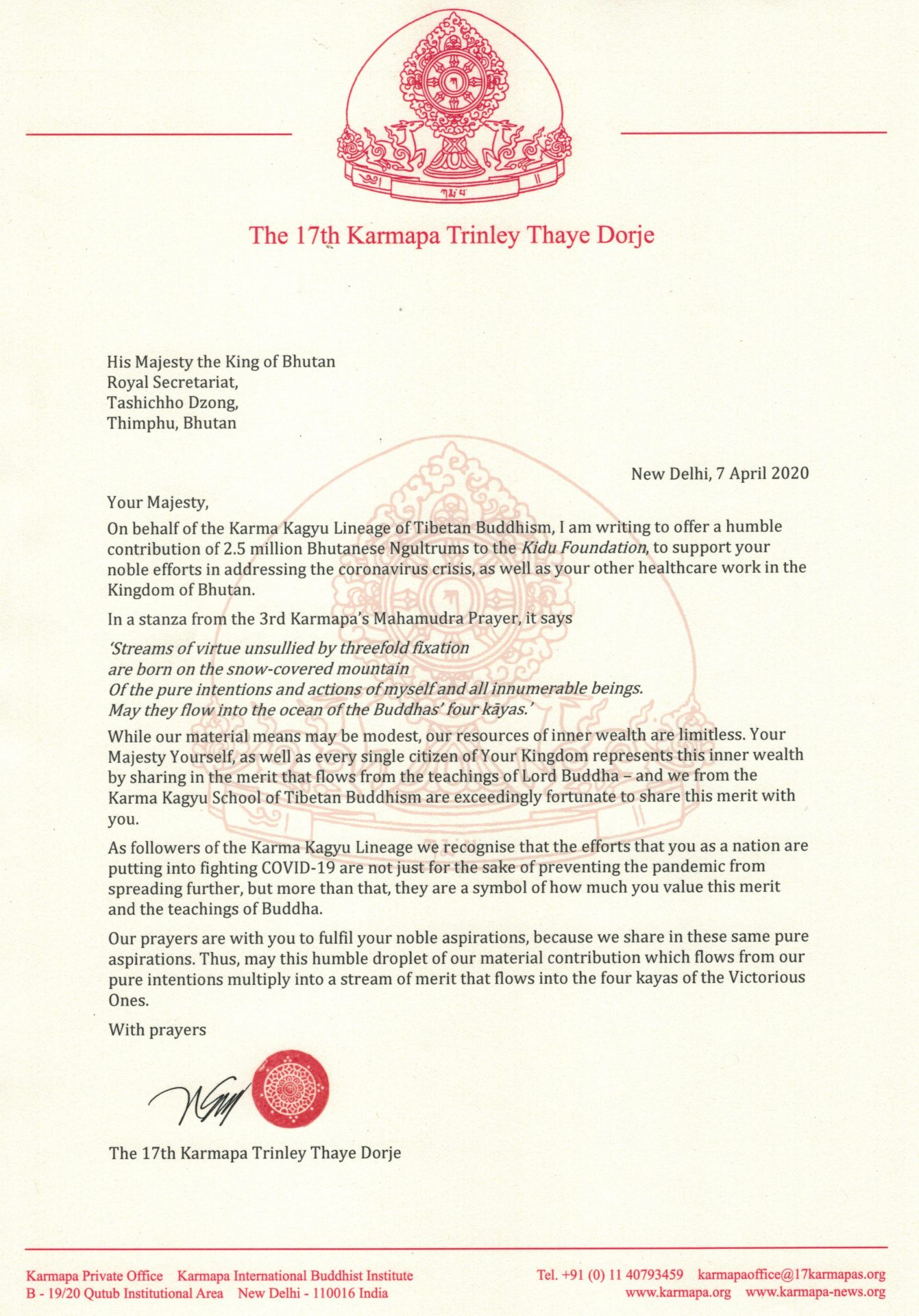 Letter to His Majesty The Druk Gyalpo Jigme Khesar Namgyel Wangchuck, King of Bhutan, dated 7 April 2020