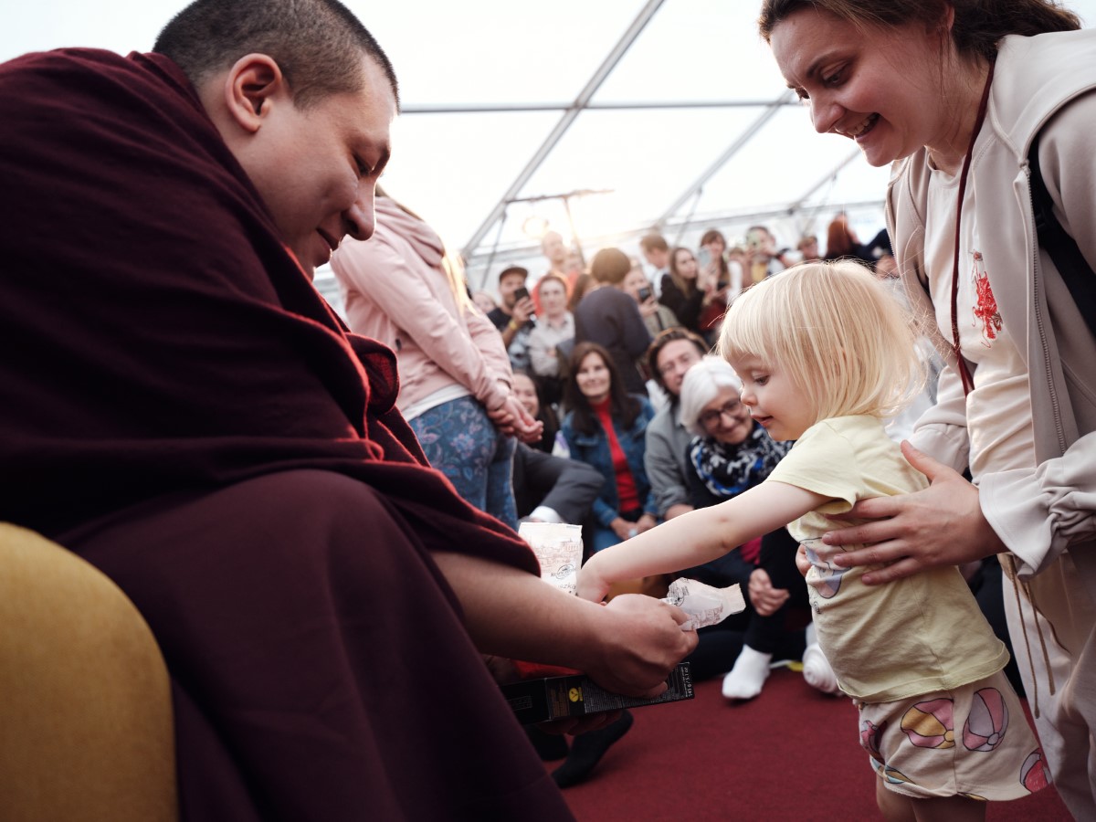 On Saturday Karmapa gave a Dharma talk on the topic of Buddhist refuge and held a question-and-answer session. This was followed by a special children’s blessing, where youngsters of all age groups – babies, toddlers and preteens alike – got an opportunity to spend a moment with Karmapa and receive a candy or two from him.