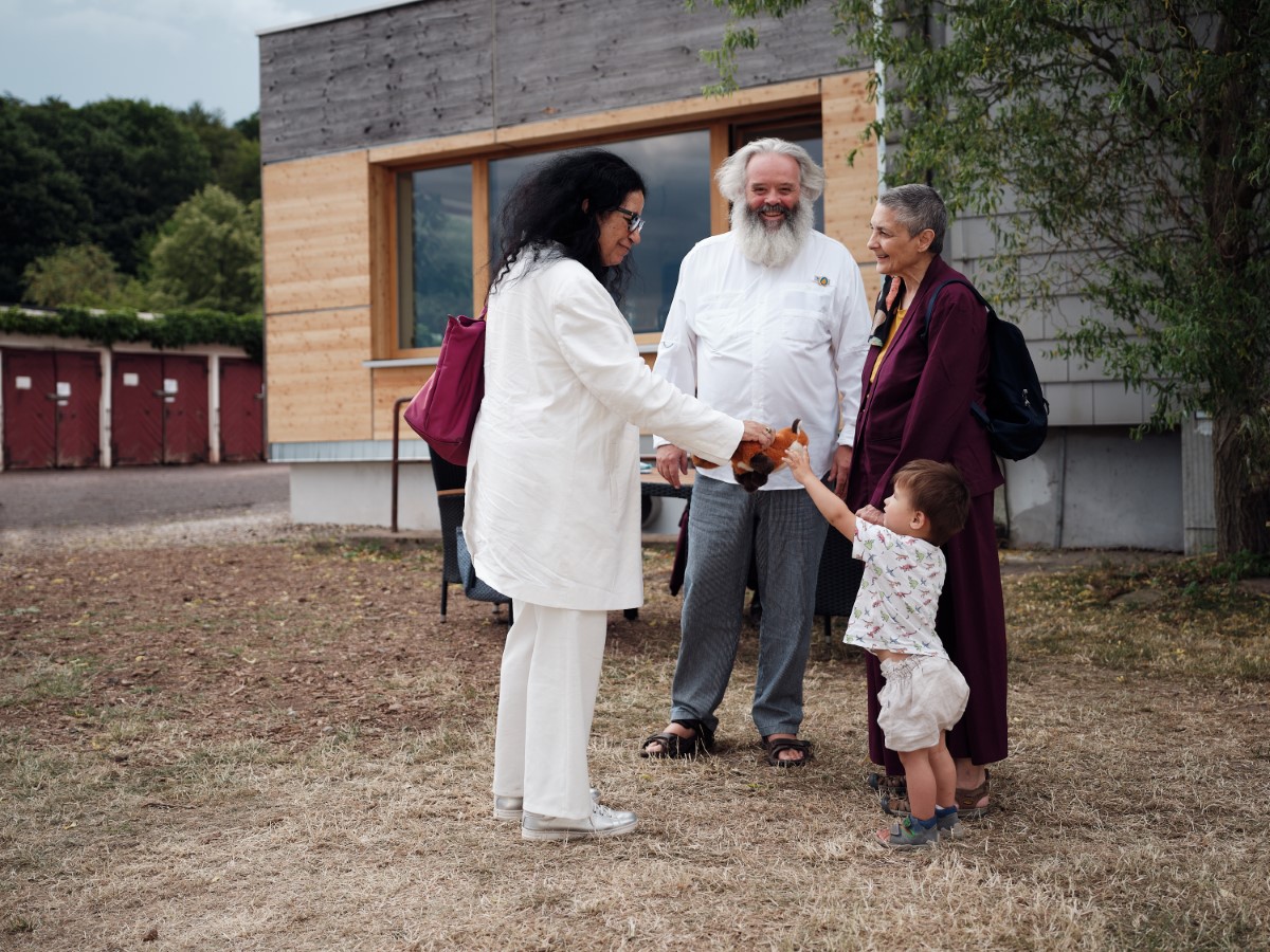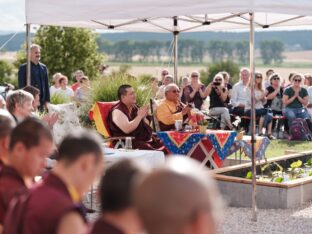 On the afternoon of Monday the 17th of July, Karmapa consecrated the new stupa in the Möhra Dharma Village. After a speech by Mr. Schilling, Karmapa and his monks performed a consecration ritual at the beautifully decorated stupa site, after which they toured around the residents’ accommodation and the premises of the Dharma Village.