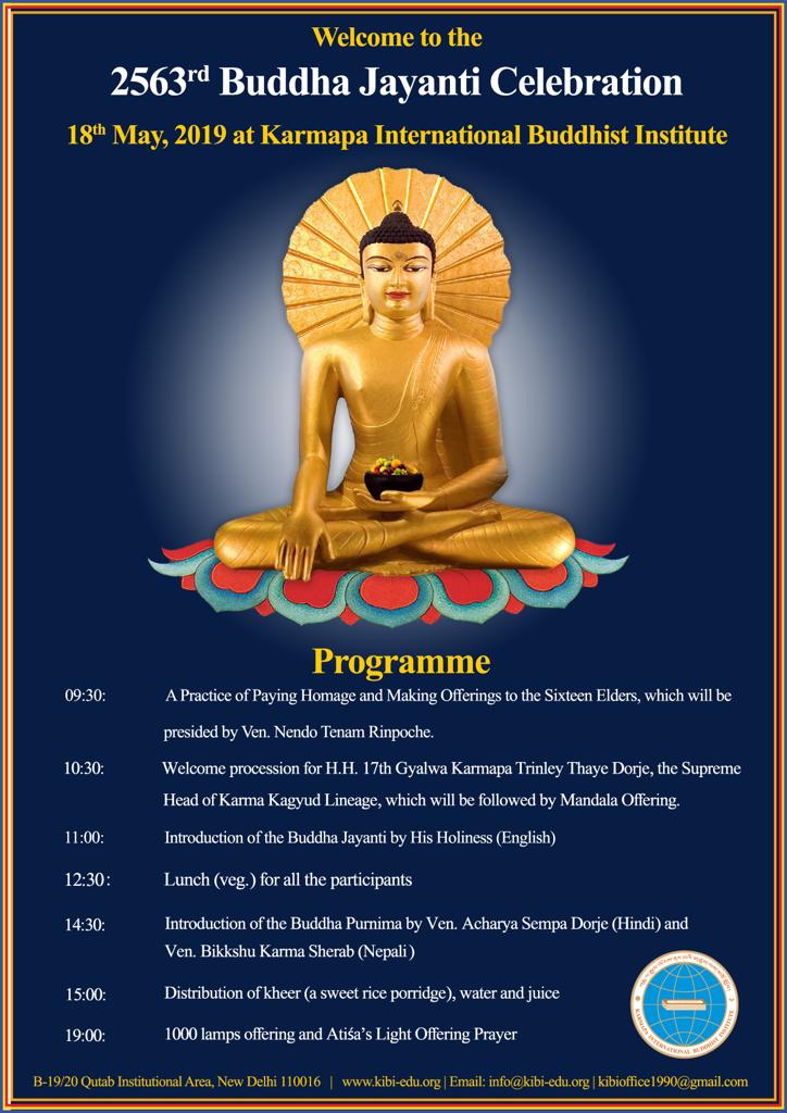 Thaye Dorje, His Holiness the 17th Gyalwa Karmapa, will lead celebrations on the auspicious occasion of the 2563rd Buddha Jayanti on 18 May 2019, at Karmapa International Buddhist Institute (KIBI) in New Delhi, India.