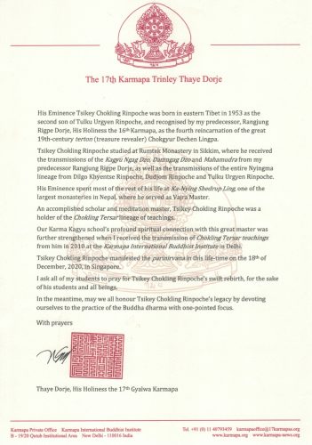 Thaye Dorje, His Holiness the 17th Gyalwa Karmapa, shares a message regarding the passing of His Eminence Tsikey Chokling Rinpoche on 18 December 2020 in Singapore.